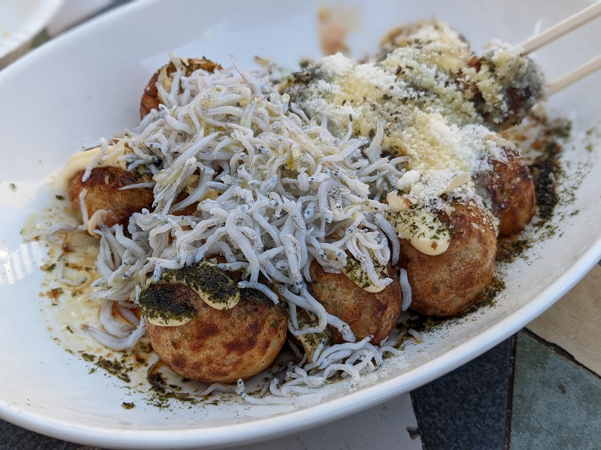 たこ焼きといえばソース。そんな概念をひっくり返す醤油味。これがまた新鮮で、なおかつウマい!一見ミスマッチにみえるシラス乗せだが醤油ダレとの相性が抜群で、やみつきになる。これはソースでは絶対にない組み合わせだw