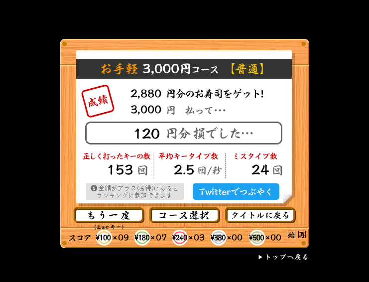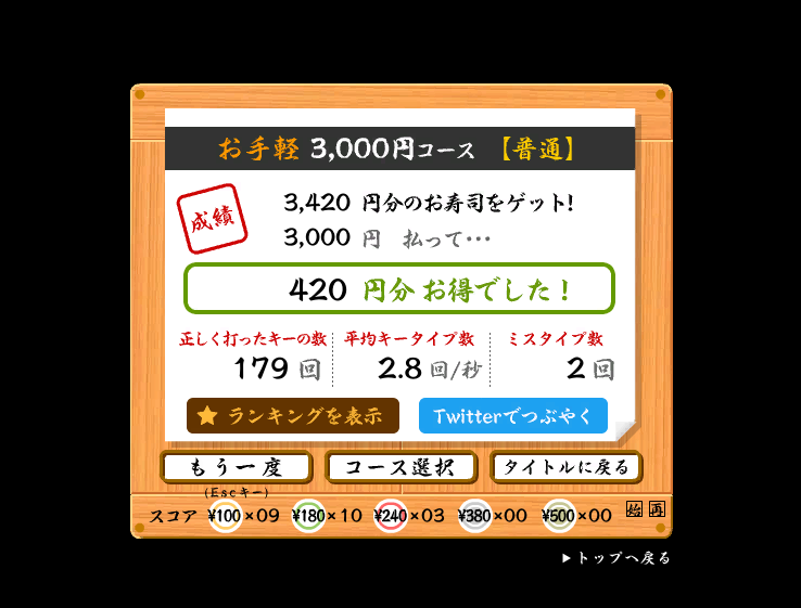 ちなみにウチの奥さんと電話しながら「スピード重視」で寿司打をした結果がこれだ👇